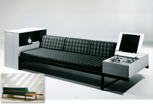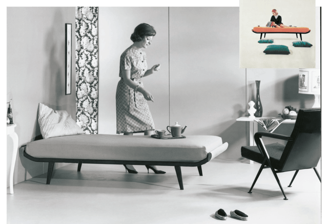 The Couchette, designed by Friso Kramer offers lots of possibilities. It is a multifunctional product. It is both a (day)bed and a couch in-one, with removable pillows and a integrated floating table. It has a geometric shape and the legs in the corner give the Couchette a clear and robust appearance.