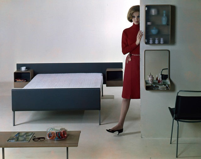 The Auronde is made of beech wood with characteristic aluminum details and rounded legs. Frans de la Haye wanted to design a sustainable and modern bed. Not just a functional bed, but a decent piece of furniture in which one can read or watch television. It is the first bed in which luxury and comfort are brought together. That was a perfect fit in the seventies, at that time central heating came tot the bed room which changed the function of the bed room. The bright colors make the Auronde a piece of furniture that turns the bed room into a living room.